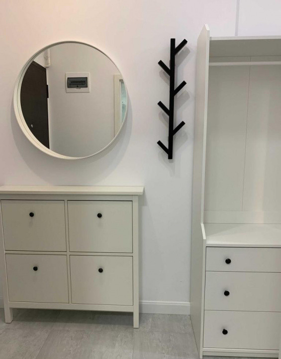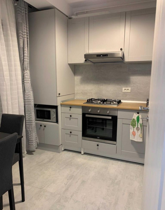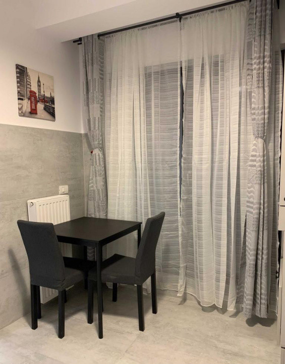 Bucataria este mobilata si dotata cu aparatura electrocasnica noua si in garantie ( plita,cuptor electric, hota, frigider). Tot in bucatarrie este amenajat un loc de luat masa pentru 2 persoane. Livingul este amenajat intr-un stil minimalist cu mobilier simplu, canapea extensibila , TV, masuta de cafea .