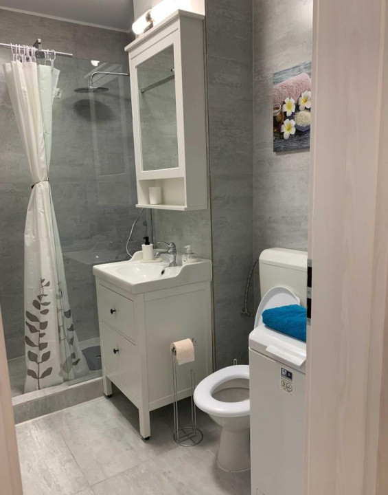 Incalzirea se realizeaza prin centrala termica iar pentru racire este montat un aparat de aer conditionat Gree, 12K. Holul de la intrare este generos si beneficiaza de un pantofar, cuier si un dulap pentru haine. Baia este complet amenajata si dotata cu obiecte sanitare noi si moderne si masina de spalat rufe. Beneficiaza de 1 balcon cu dublu acces din bucatarie si camera.