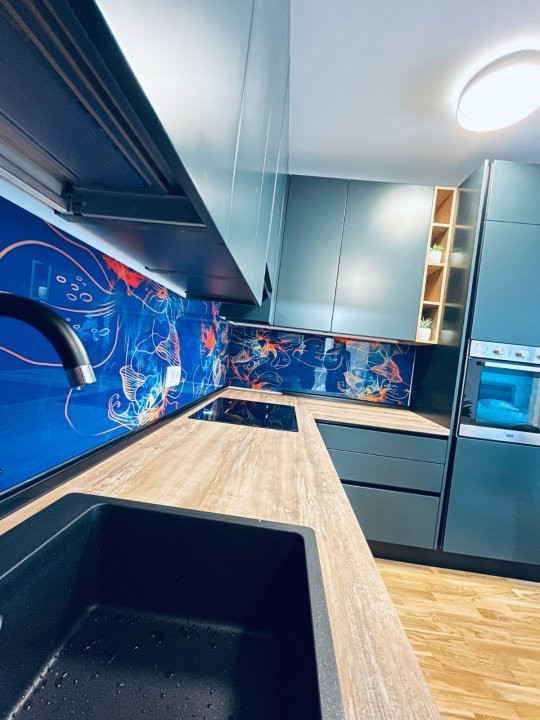 Finisajele interioare si exterioare sunt PREMIUM: ferestre ALUMINIU SCHUCO, obiecte sanitare Laufen; baterii Grohe, incalzire prin pardoseala cu dispozitiv de setare a temperaturii ambientale pe fiecare zona de locuit, parchet triplu stratificat, lemn natural nobil Tarkett 14 mm, marmura piatra naturala Royal Cream, usi PINUM INNOVA alb, inaltimea camerelor de 2.80 m