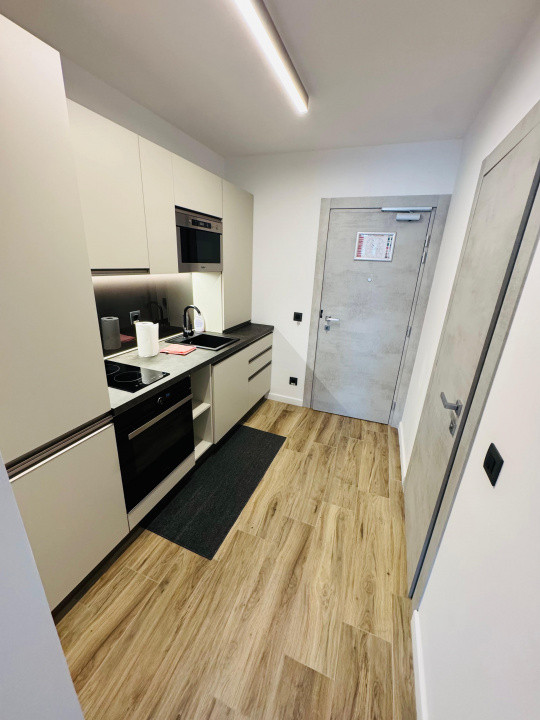 Studioul are o compartimentare practica: bucatarie open space, zona de dormitor cu pat dublu si spatiu de depozitare, baie cu cada si balcon + zona de living cu canapea si tv, etaj 5/11