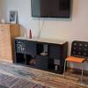 Apartamentul are un living generos (18,5 mp) mobilat modern cu canapea extensibila, fotolii, bufete si masa + birou cu raft si are un tv smart cu diag 154 cm si AC. Dormitorul mare are un dressing facut pe comanda, pat de mijloc cu saltea noua, AC si tv.