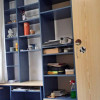 Dormitorul mic are canapea extensibila, dulapuri, biblioteca cu birou si rafturi (facute pe comanda).